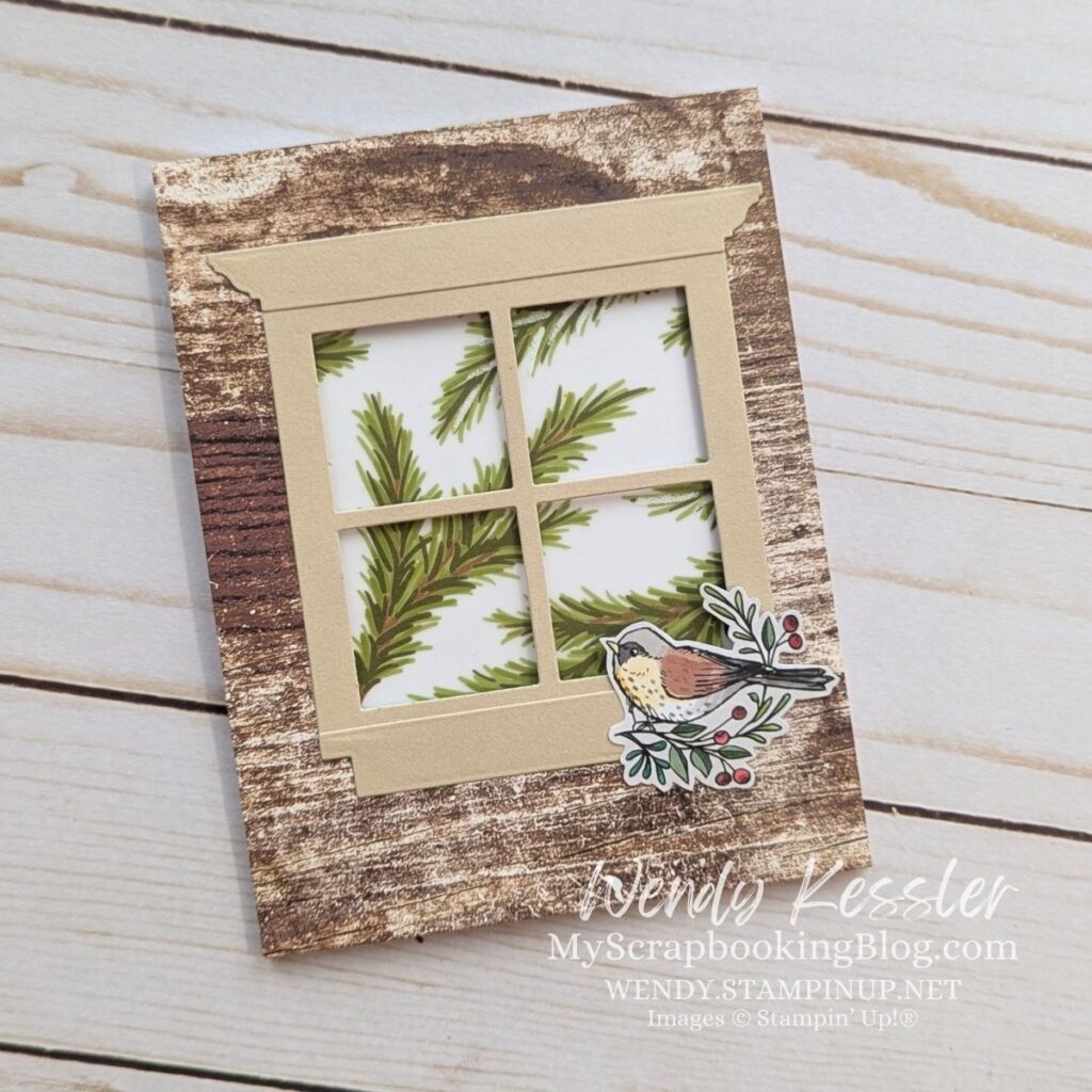 This one is quite different for me. I really wanted this window die from CTMH and finally used it. The bird is cut from Stampin’ Up’s Nests of Winter paper so you can see I have a mix of products. The woodgrain paper and the window are adhered to the card with dimensionals to give more of a 3D look through the window.